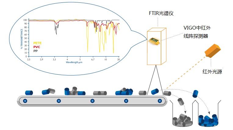 通過檢測每個標記的吸收帶,中紅外線陣檢測器可以“看到”一種被測塑料小件。與NIR的光譜識別相比,在MWIR范圍內(nèi)可以更精確地識別和鑒定聚合物等有機化合物。同時在FTIR中使用線陣探測器可以消除移動部件和濾波片帶來的影響,這簡化了FTIR設(shè)備并提高了系統(tǒng)可靠性。在制造此類OEM 分光光度計中,VIGO的32元非制冷線陣探測器被推薦使用,超高信噪比和快速的響應(yīng)時間可以完美地解決實際應(yīng)用中的問題。