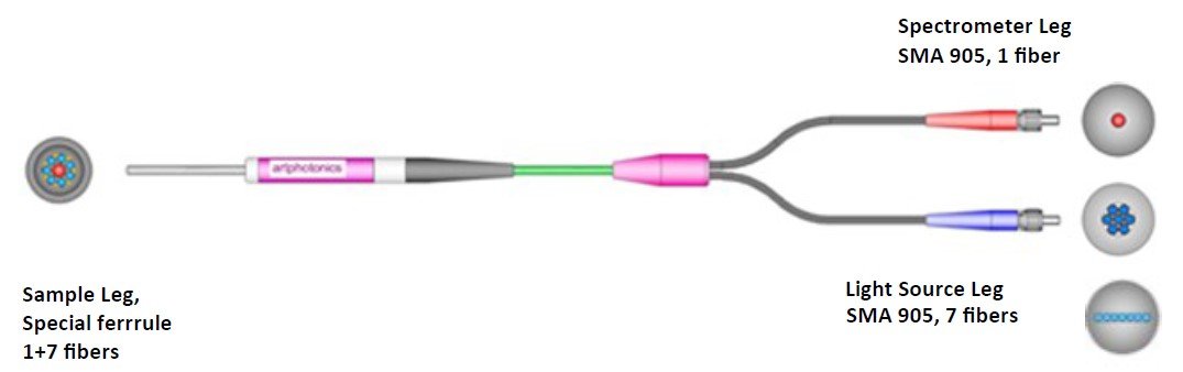 光纖探針的光譜分析過(guò)程是由一束粘在一起的光束,為光譜儀、光輻射(包括LED,激光,燈等),介質(zhì)反射、熒光及吸收的光譜分析提供了較好的耦合效率
