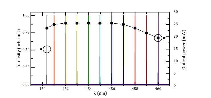 在 I = 250mA 驅(qū)動的 Littman-Metcalf 外腔中獲得增透膜(正面)激光二極管的光功率和光譜。所研究的激光二極管可在近 10 nm 的寬范圍內(nèi)自由調(diào)諧。在整個調(diào)諧范圍內(nèi)獲得了 SMSR 大于 30 dB 的單模發(fā)射。